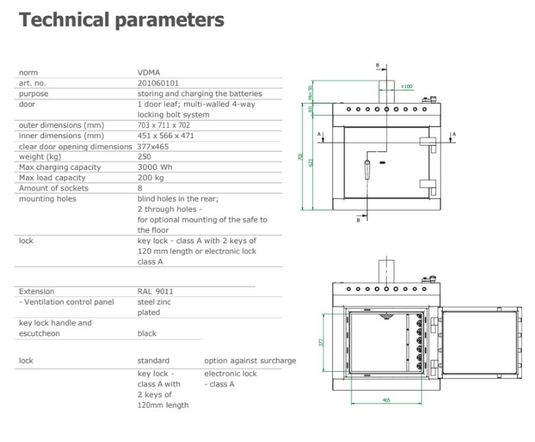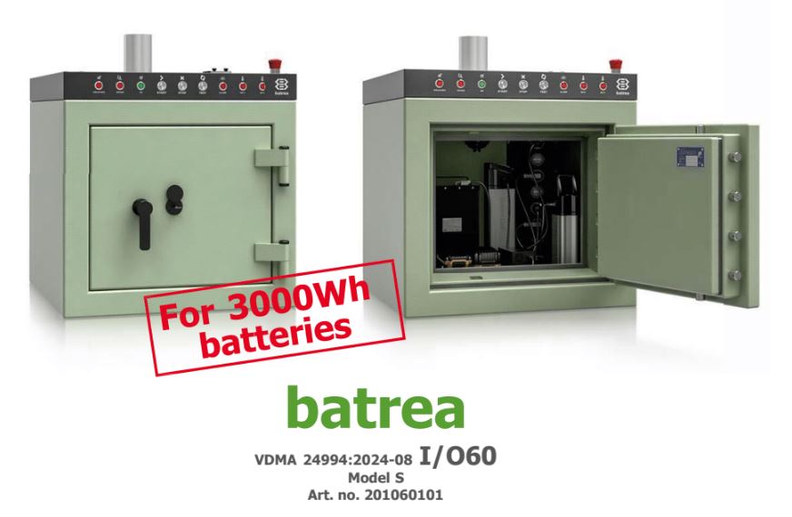 The storage safe complies with the VDMA guidelines 24994:2024-08, according to which the cabinet can withstand extreme conditions,such as uncontrolled fires and battery explosions, while maintaining the highest safety standards.The product is tested and certified to VDMA standard sheet 24994:2024-08 as an I/O60 lithium-ion battery storage safe.